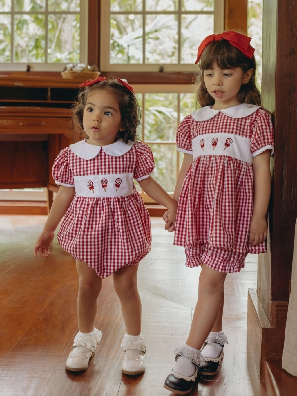 Confeccionado em algodão 100%, este conjunto traz o charme do xadrez vichy vermelho com golinha branca, que deixa o look ainda mais delicado e atemporal.