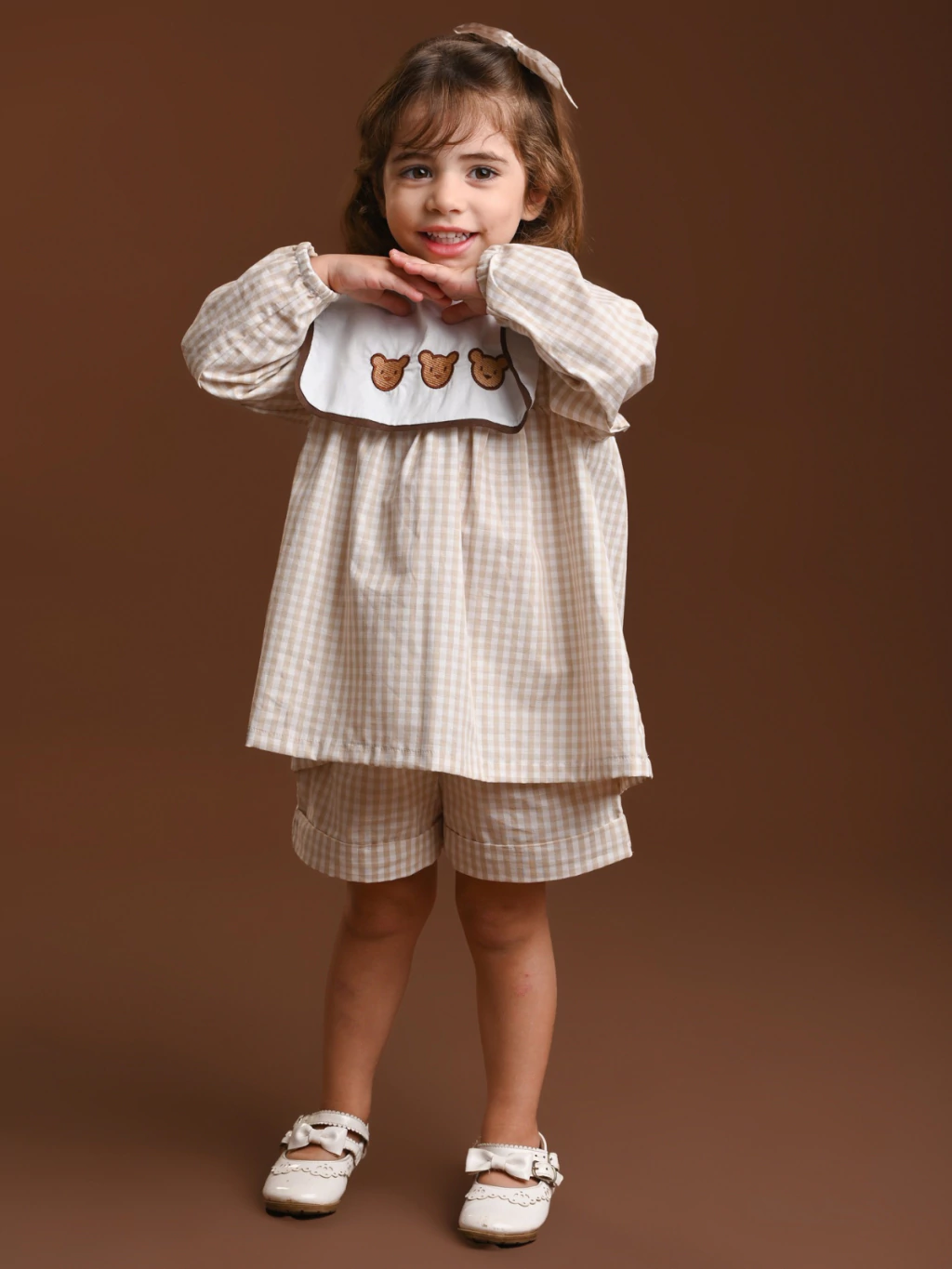 Conjunto Ursinho um charme que atravessa o tempo! Nosso conjunto é feito em 100% algodão, perfeito para a pele delicada das pequenas. A gola bordada com ursinhos e acabamento em viés traz um toque lúdico e elegante, enquanto o short com elástico na cintura garante conforto para brincar à vontade.